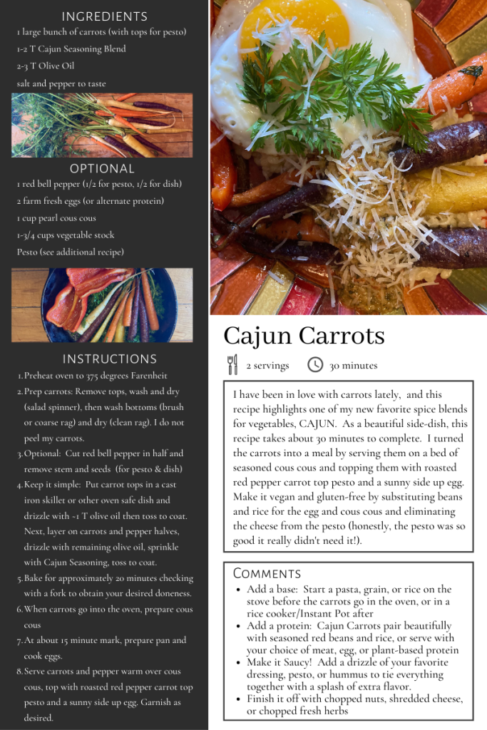 The full title of this recipe should probably be something long and ridiculous like “Cajun Carrots on a bed of Seasoned Couscous topped with Roasted Red Pepper and Carrot Top Pesto served with a Sunny Side up Egg,” but let’s be real, that just isn’t that catchy! So let’s dispel with titles and simply get on with it! Instead of writing up one large recipe for the entire dish, I broke it down into 4 different segments: 1) Cajun Carrots, 2) Roasted Red Pepper and Carrot Top Pesto, 3) Instant Pot Seasoned Couscous, and 4) Sunny Side up Egg.